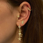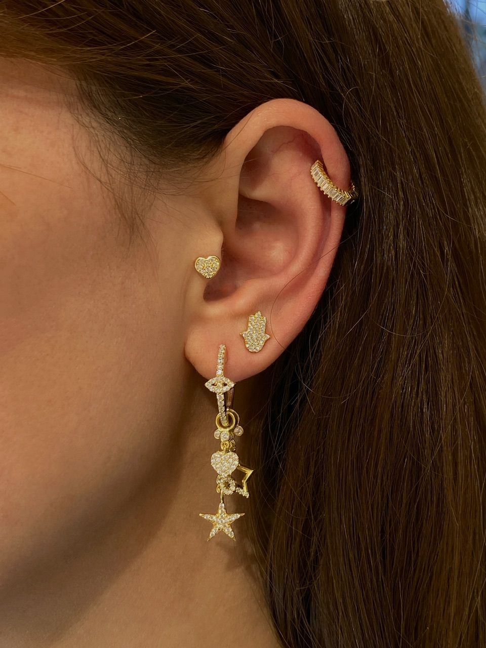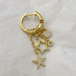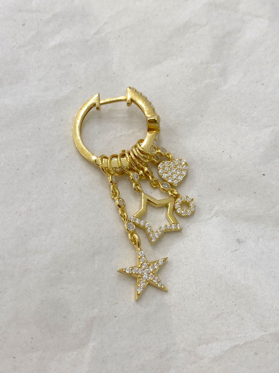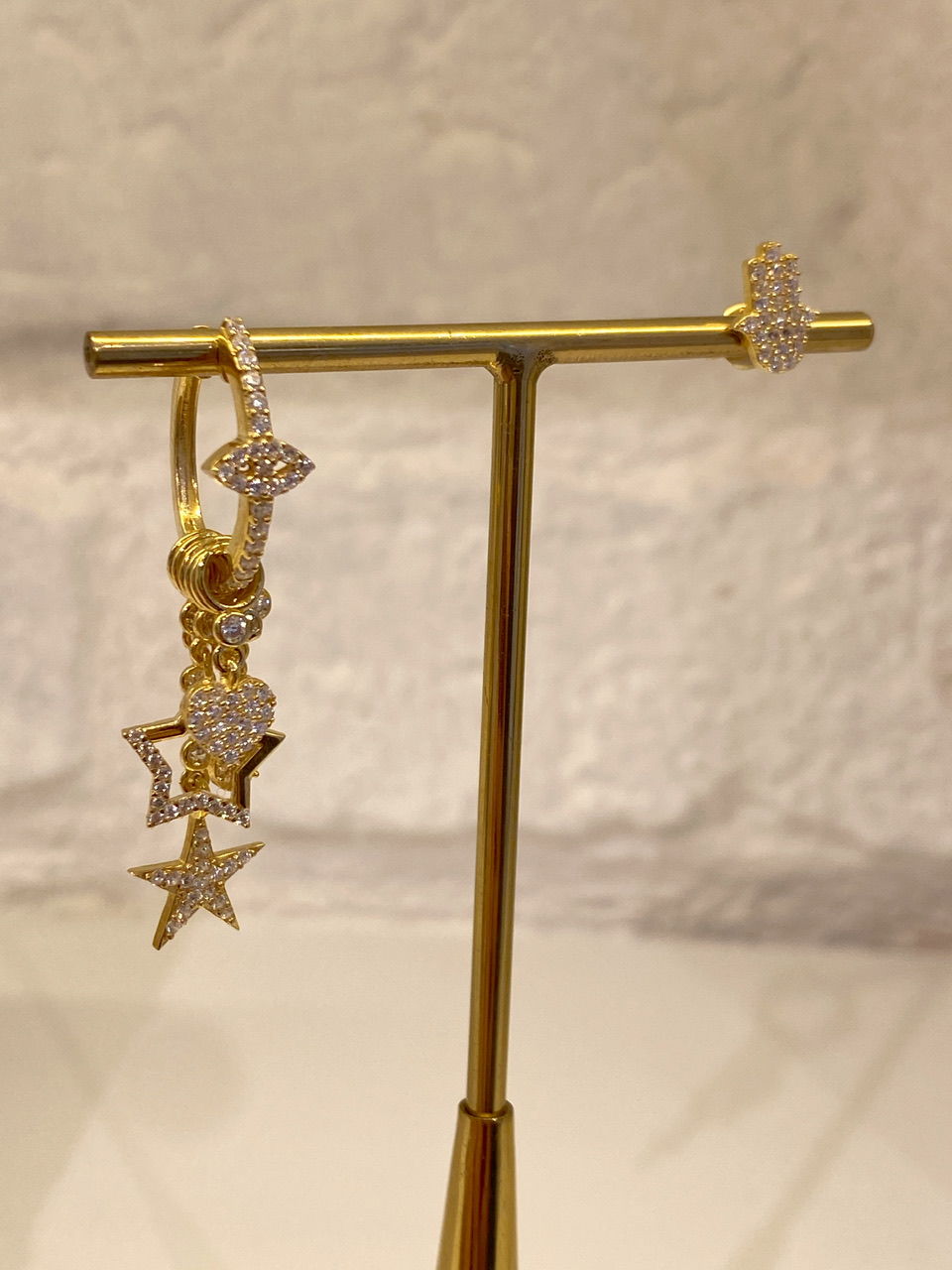 Sold as pair. One earring features a dangling design, while the other is a stud. The charms are removable.
