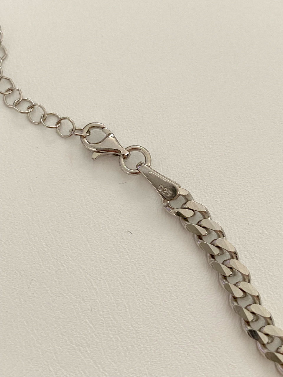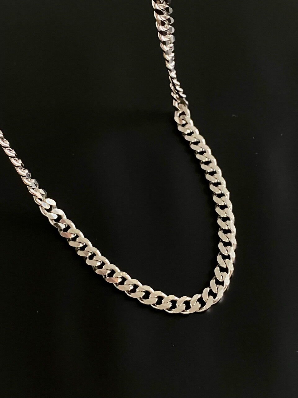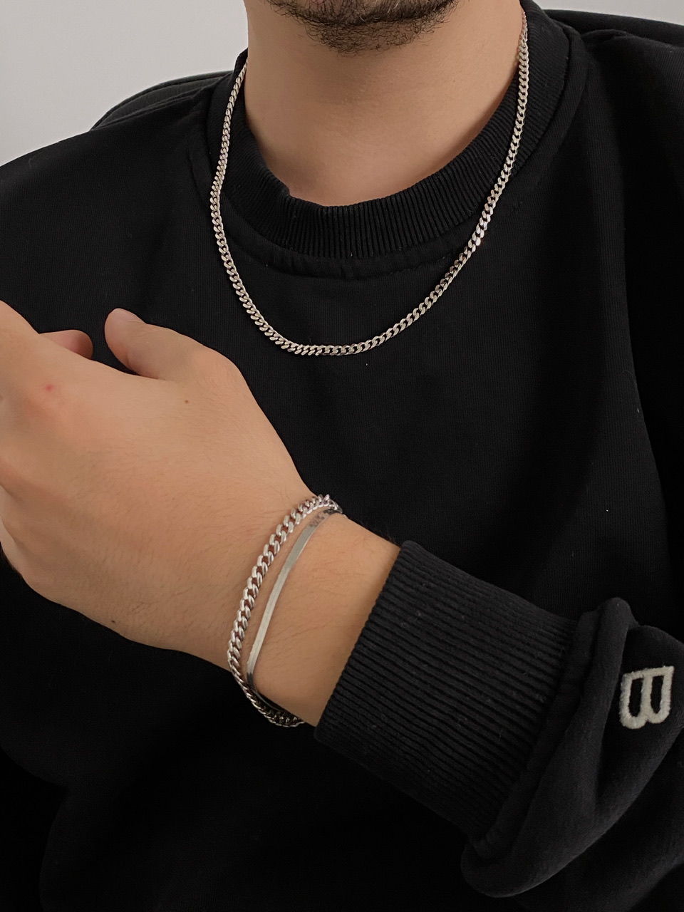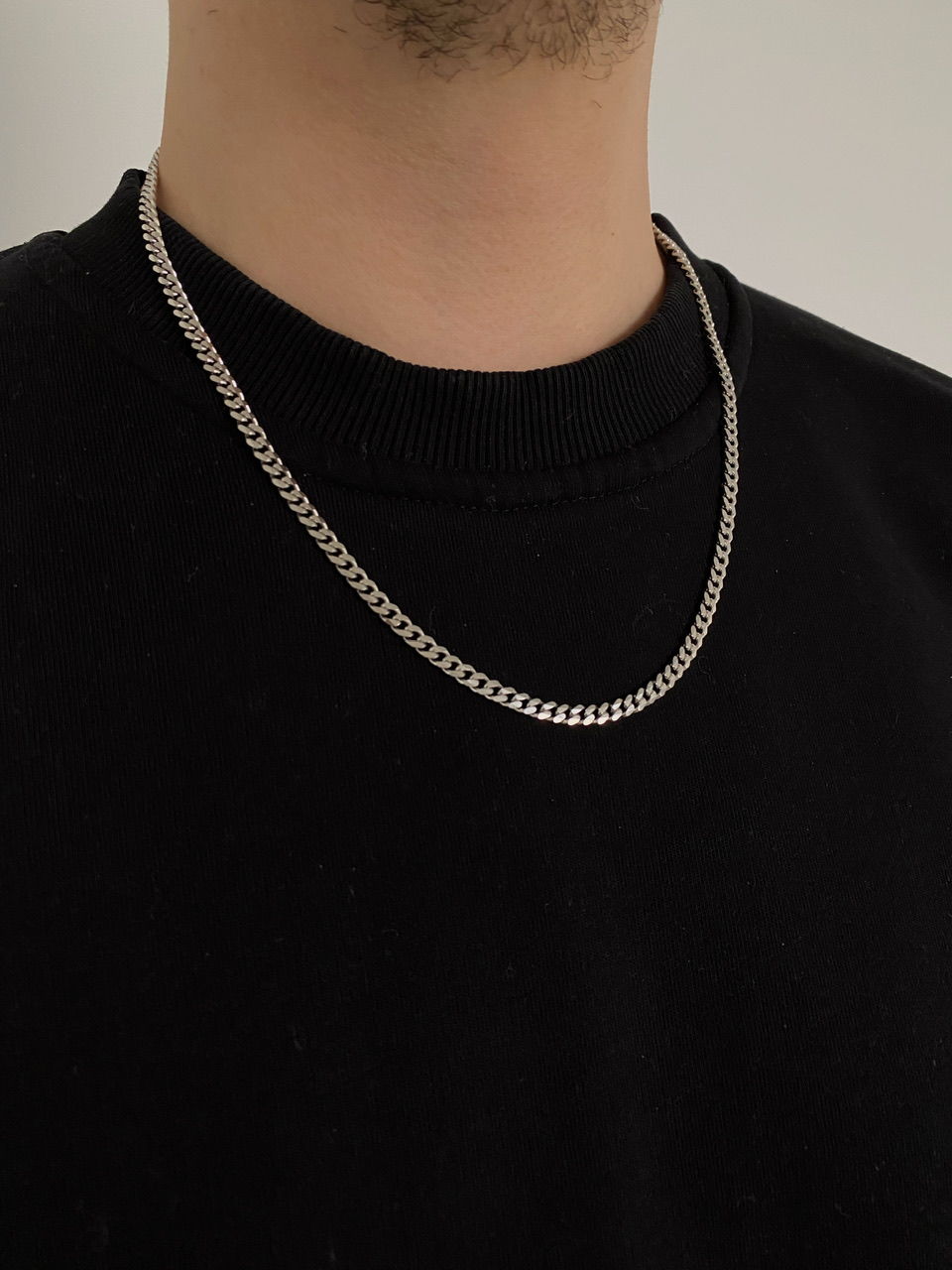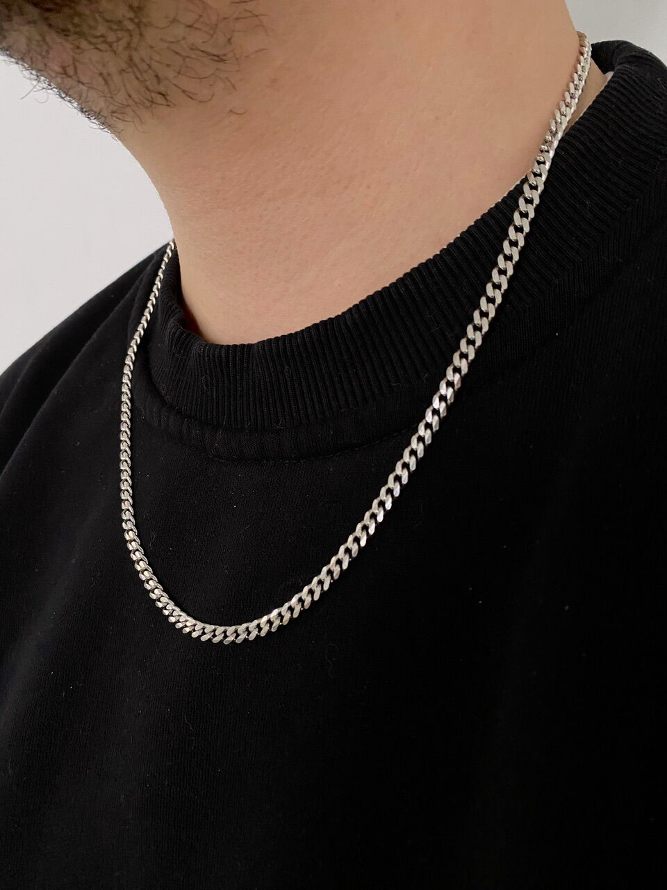 The male model in the photos is wearing a 50+5 cm chain with a thickness of 5 mm.