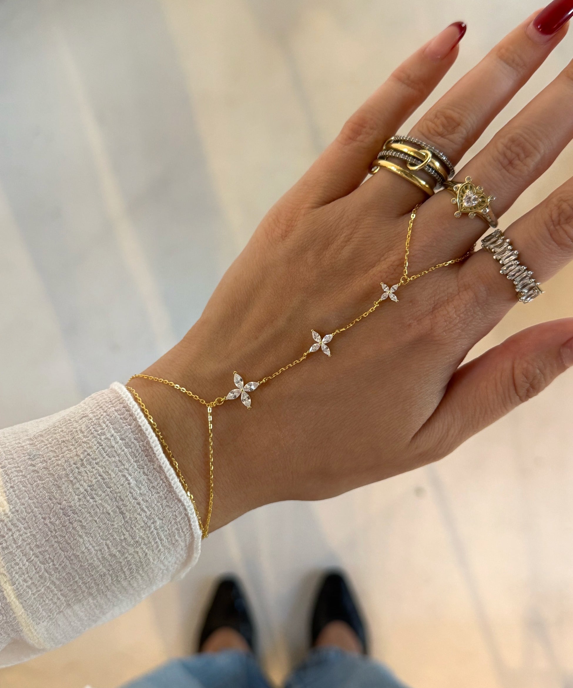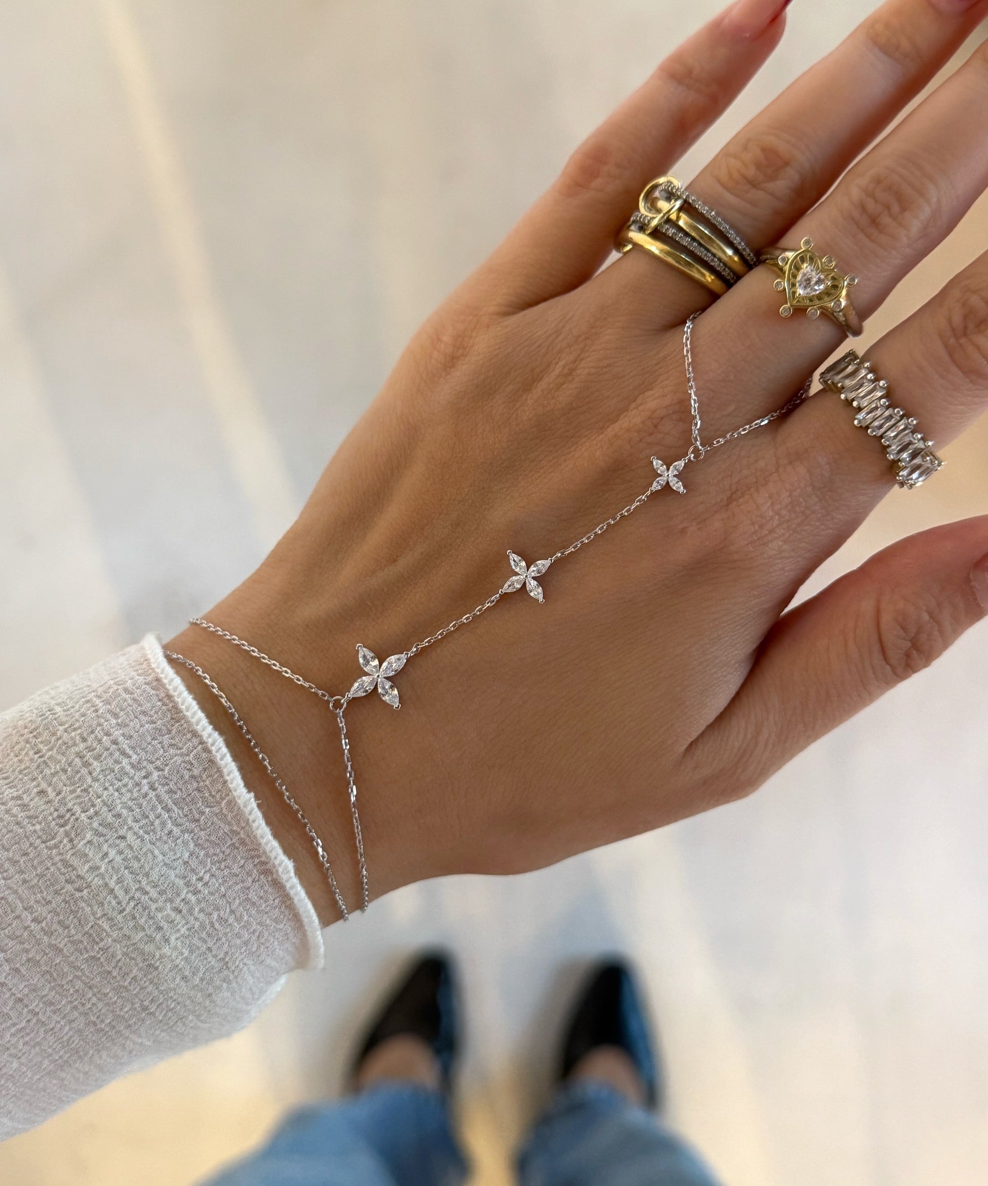 925 Silver | Triple Stone Leaf Flower Hand Chain