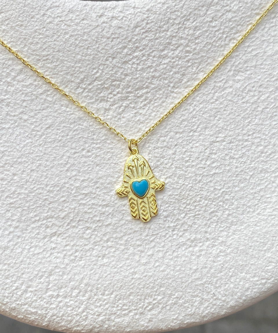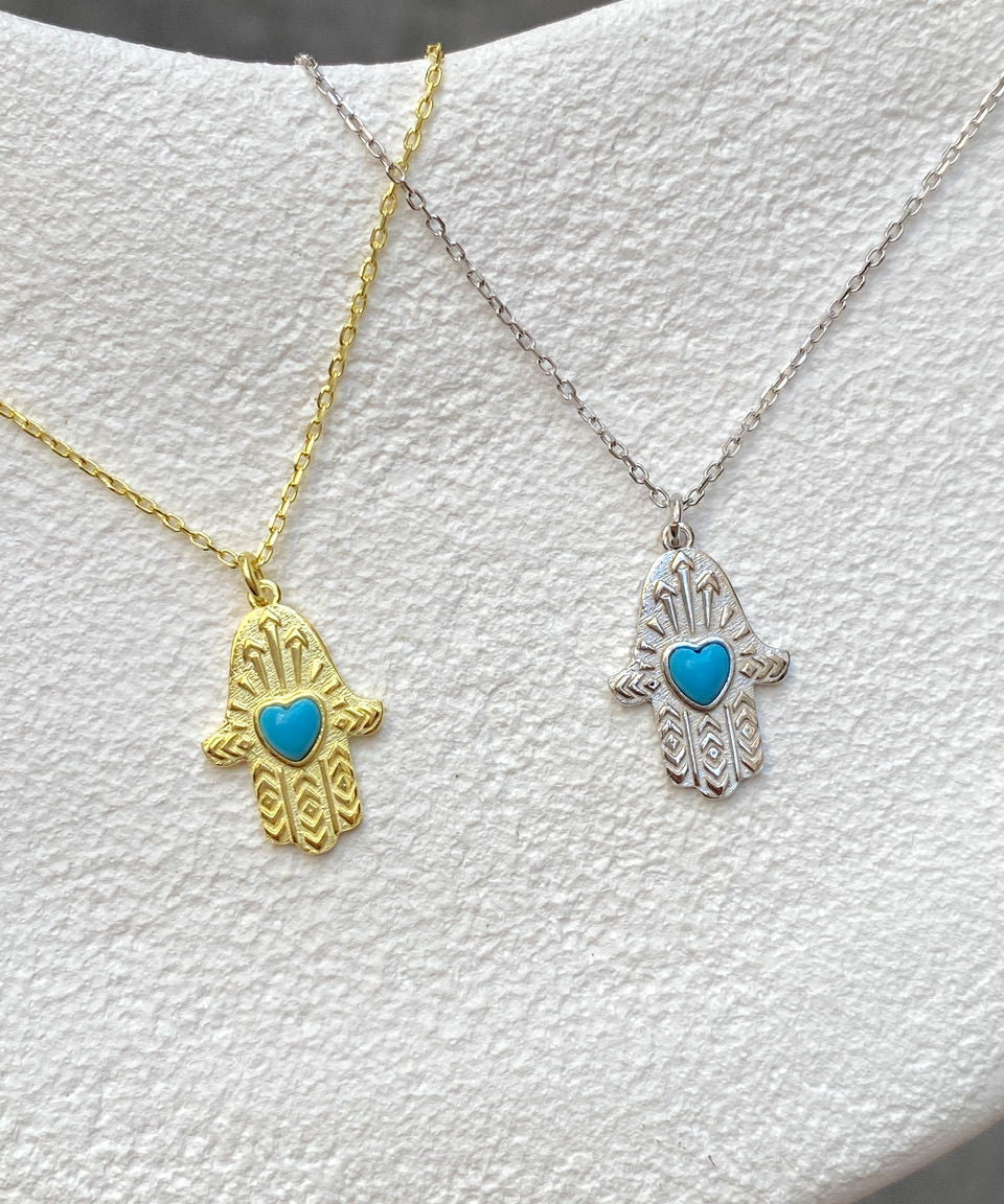 925 Silver | Turquoise Stone Hamsa Necklace with Heart Detail