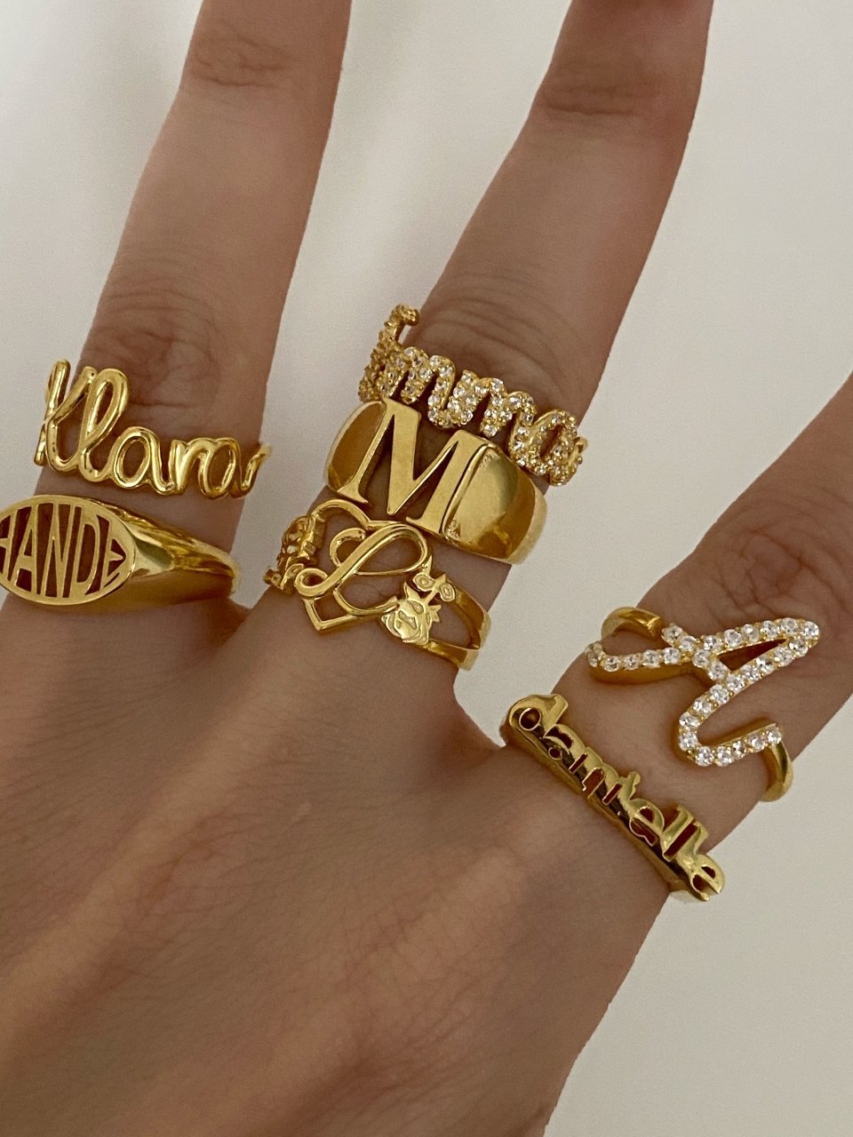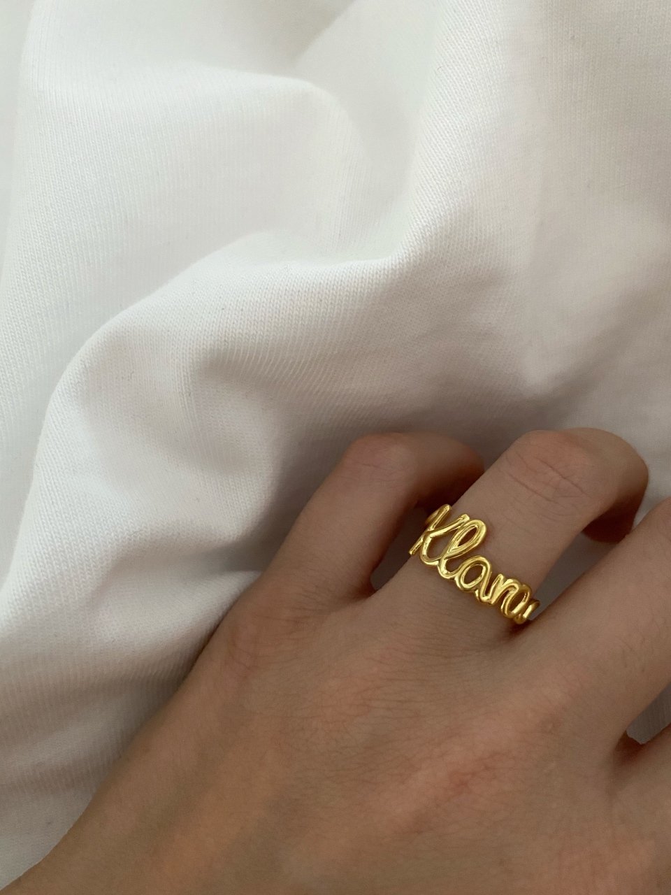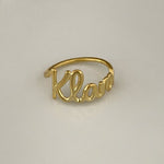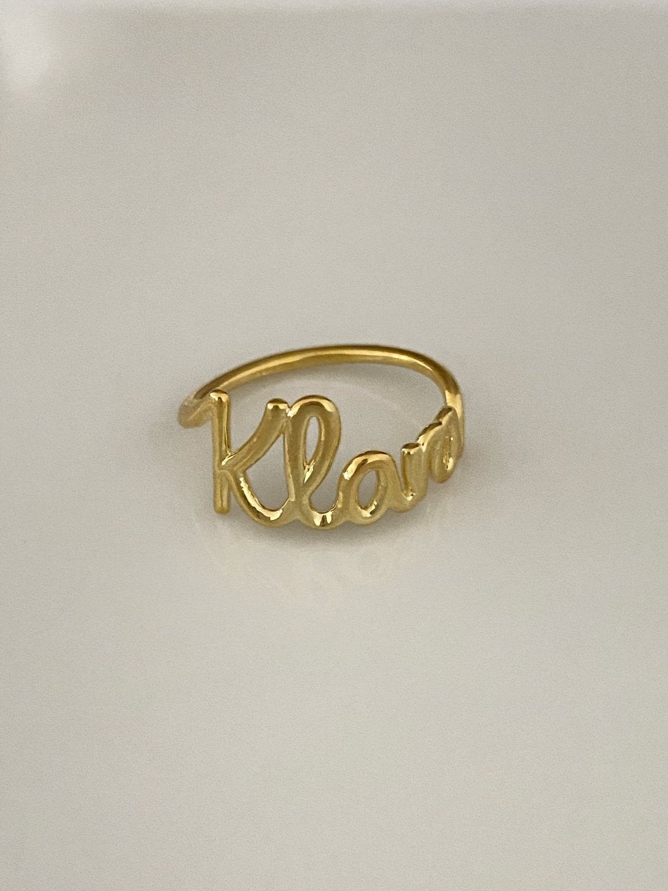 A gold-colored personalized ring with the name 'Klara' written on it, displayed against a gray background.